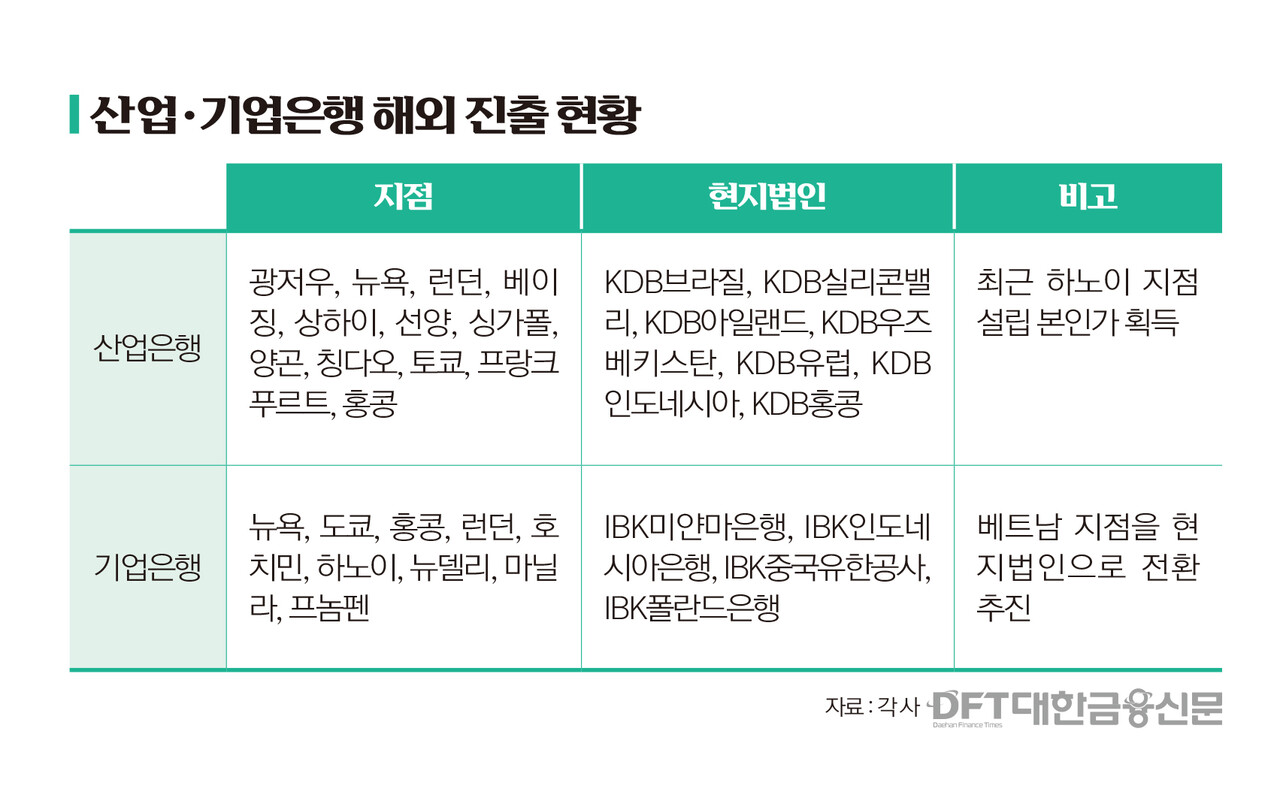국책은행들의 해외 진출에도 가속도가 붙었다. 한국산업은행과 IBK기업은행이 베트남을 중심으로 해외 영업망을 확대하며 정책금융 수행 범위를 넓히고 있다.